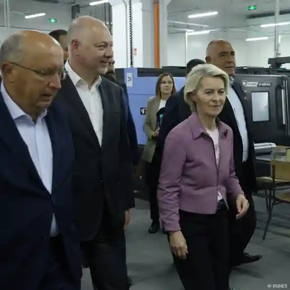 EU Commission President Ursula von der Leyen visiting the engineering plant in Sopot, Bulgaria, ahead of the establishment of a joint venture with Rheinmetall. Location: Sopot, Bulgaria