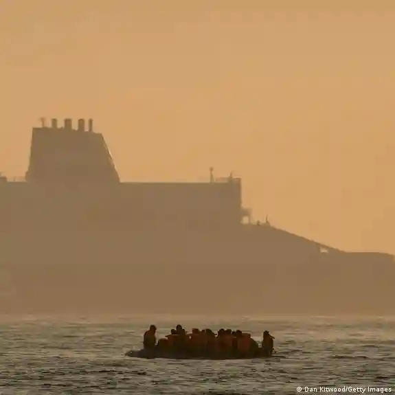A raft full of migrants crosses the English Channel as a ferry is seen behind it